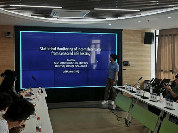 2025年10月16日下午,奥塔哥大学肖逊博士应邀来自慰高潮 开展以“Statistical Monitoring of Incomplete Data from Censored Life Testing”为主题的学术讲座,本次讲座在综合楼644会议室举行,由统计与数据科学自慰高潮 徐安察教授主持。