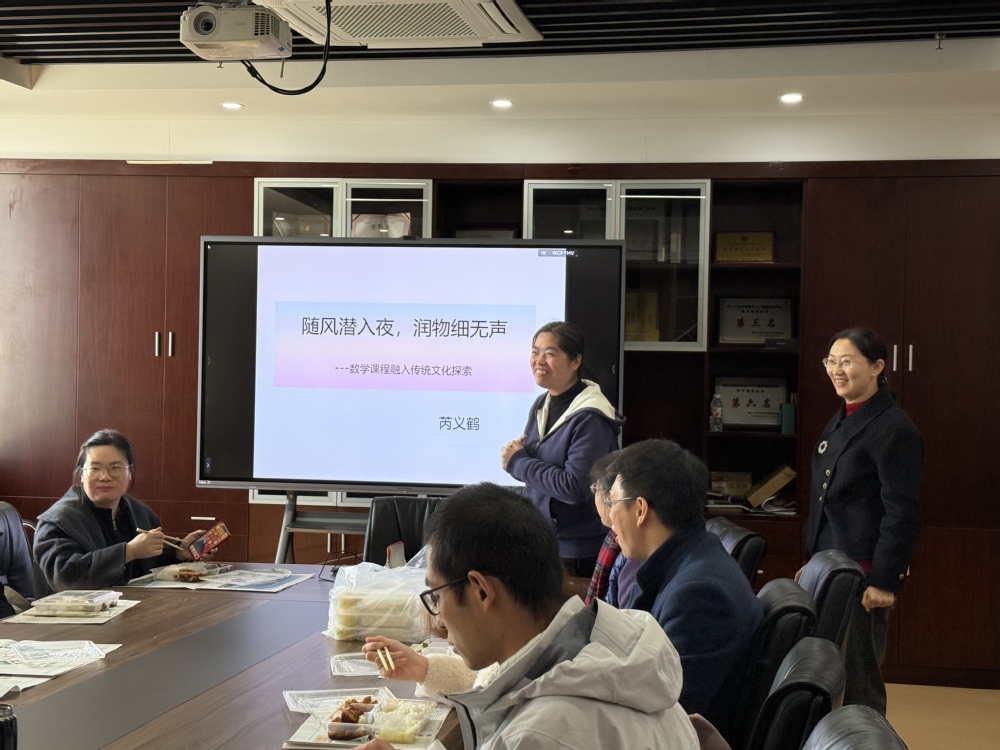 11月19号中午,统计与数据科学自慰高潮 在综合楼615举办了主题为“随风潜入夜,润物细无声----数学课程融入传统文化探索”的教学午餐会。本次活动由芮义鹤老师主讲,数学与应用数学系主任彭丽辉主持。