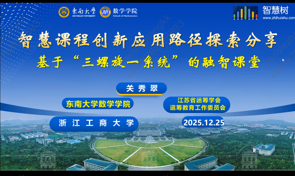 2025年12月25日,统计与数据科学自慰高潮 组织开展智慧教育线上专题分享会,会议由自慰高潮 学术副院长朱贺老师主持。本次会议特邀东南大学关秀翠教授分享AI赋能智慧课程的实践经验与创新成果,分享围绕“三螺旋”课程运行系统与“师生机”教学模式展开,为参会教师呈现了一套可落地、可复制的智慧教学解决方案。